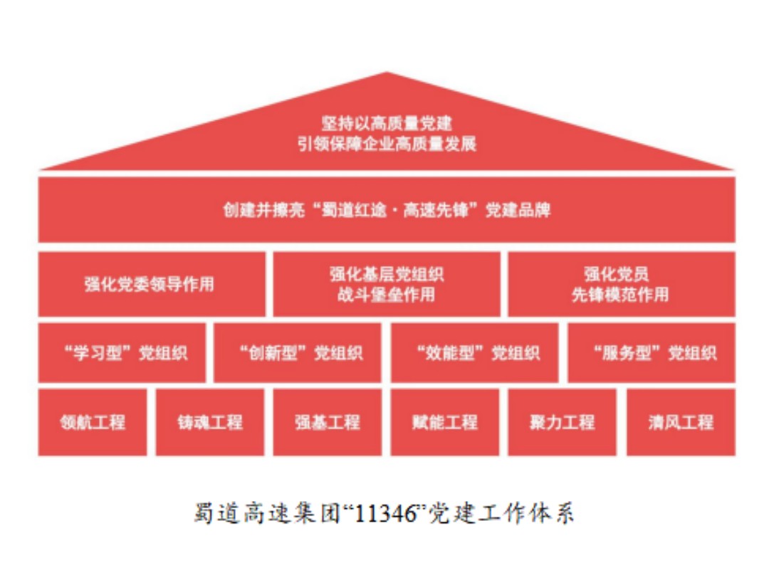 蜀道高速集团党委深刻分析当前党建工作与中心工作融合中存在的挑战与问题,坚持以“系统性谋划、标准化管理、项目化推进、目标化落实”为导向,不断完善党建工作机制,创新工作方法,总结形成了特色鲜明、务实管用的“11346”党建工作体系。该体系以高质量党建引领保障企业高质量发展为主线,着力打造并擦亮“蜀道红途·高速先锋”党建品牌,推动党委领导作用、基层党组织战斗堡垒作用和党员先锋模范作用持续强化,扎实推进“学习型、创新型、效能型、服务型”党组织建设,系统实施“领航、铸魂、强基、赋能、聚力、清风”六大工程。通过“一个坚持”把准政治方向与目标要求,“一个品牌”推动形象提升与融合赋能,“三个强化”夯实政治功能与组织优势,“四型组织”鲜明工作导向与价值追求,“六大工程”搭建实施载体与推进路径,各项机制相互衔接、协同发力,为企业高质量发展提供了坚强政治保障和组织保障。