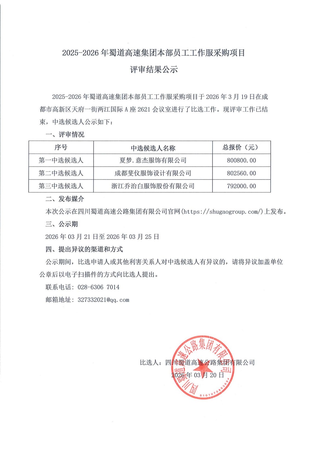 2025-2026年蜀道高速集团本部员工工作服采购项目评审结果公示