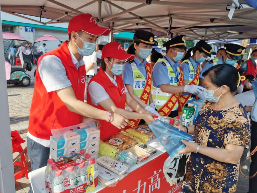 在考场外设立“爱心高考服务站”,精心搭建遮阳棚,对前来送考的家长进行交通秩序引导,同时为有需要的考生及家长们提供矿泉水、面包、药品、口罩和应急文具等,以实际行动传递爱心、服务社会,助力高考学子圆梦!
