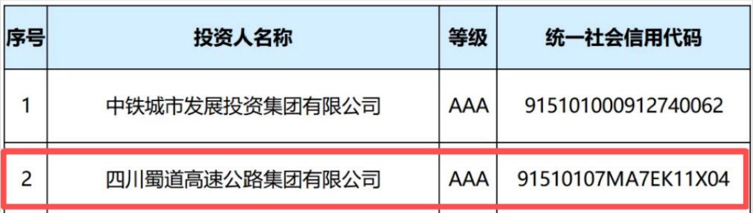 12月4日,四川省交通运输厅发布了四川省高速公路投资人2024年度信用评价结果公示,蜀道高速集团在四川省高速公路投资人2024年度信用评价中被评为AAA等级。此次评价是根据《四川省交通运输厅关于修订印发〈四川省高速公路投资人信用管理办法〉的通知》(川交发〔2021〕20号)和《关于加强高速公路投资人年度信用评价的通知》(川交函〔2022〕324号),经初评、审定、公示等程序,取得2024年度信用评价等级名单公布如下: