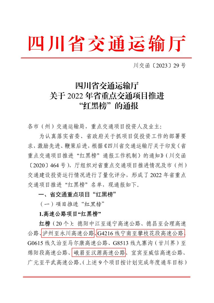 近日,四川省交通运输厅印发《关于2022年省重点交通项目推进“红黑榜”的通报》,蜀道高速集团荣登投资人项目推进“红榜”,泸州至永川高速公路、G4216线宁南至攀枝花段高速公路、峨眉至汉源高速公路、G4216线金阳至宁南段高速公路、镇广高速川陕界至王坪段、资中至铜梁高速公路6项目入选省重点交通项目推进“红榜”。