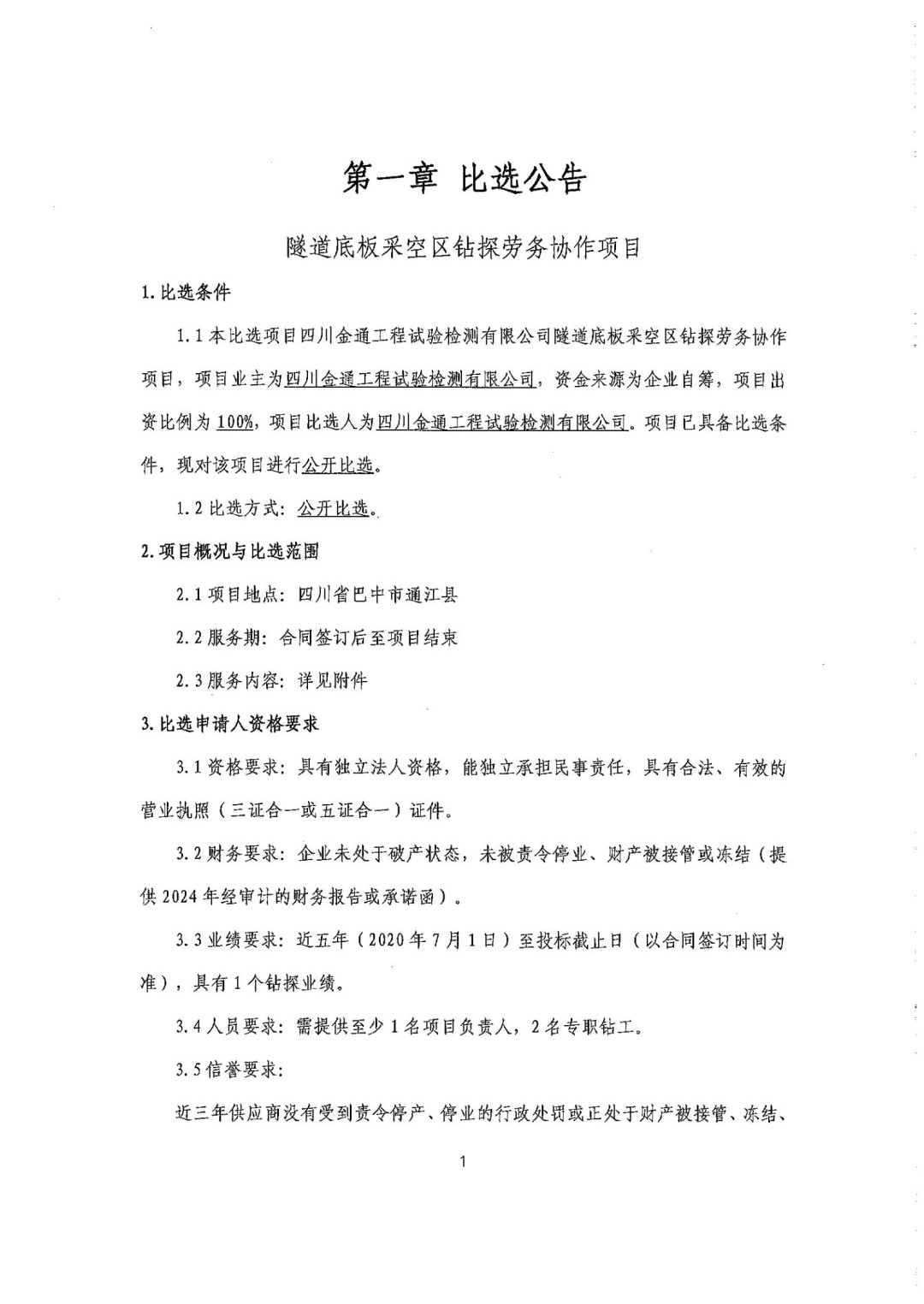 四川金通工程试验检测有限公司隧道底板采空区钻探劳务协作项目比选公告